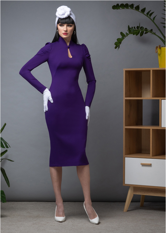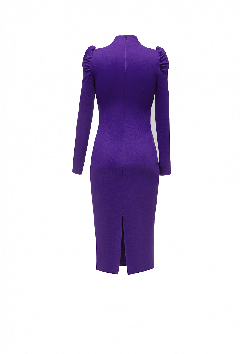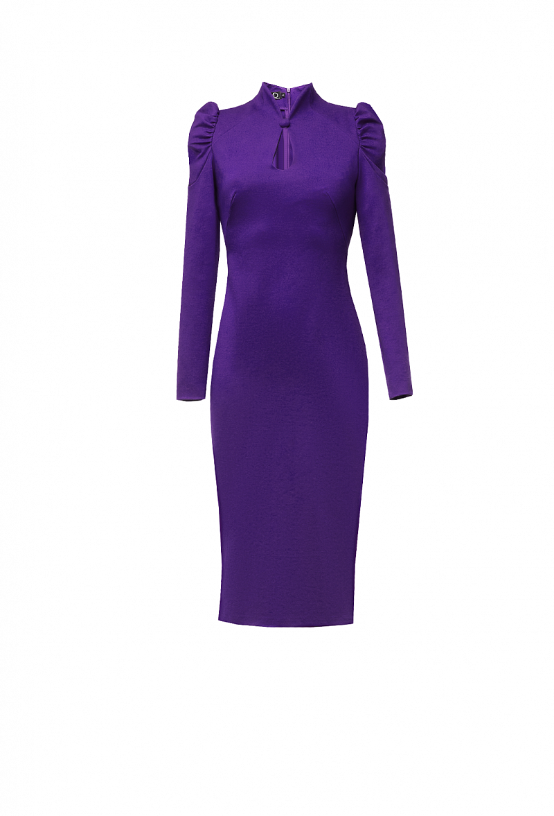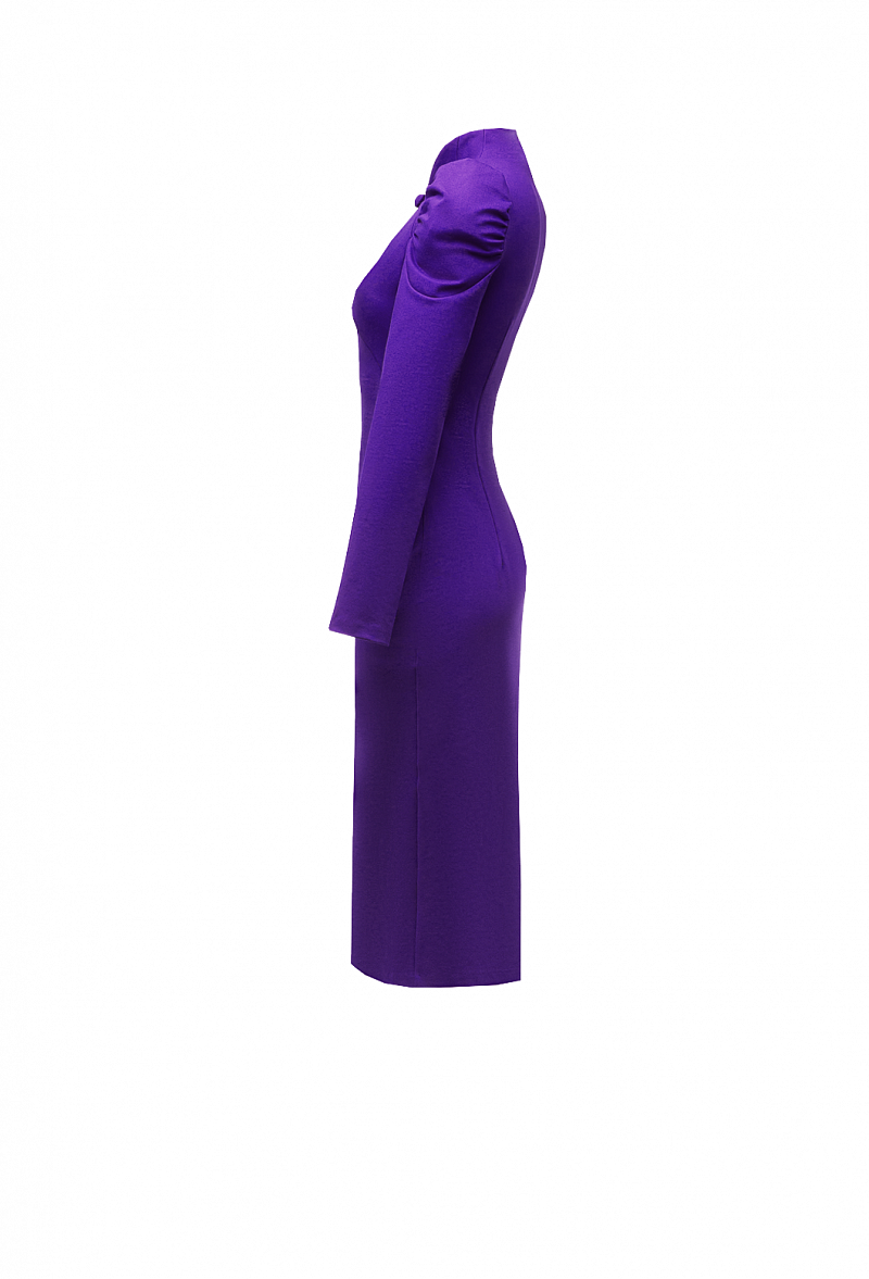 Трикотажное облегающее платье на молнии с шлицей сзади. Длинный облегающий рукав с круглой вставкой со складками в головке рукава. Воротник-стоечка. Глубокий вырез-капелька с декоративной пуговкой.