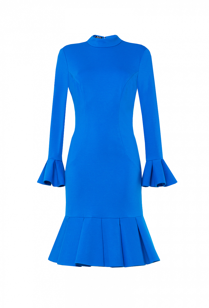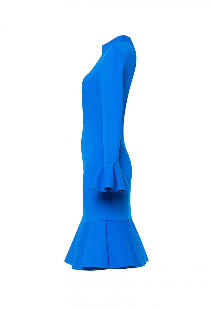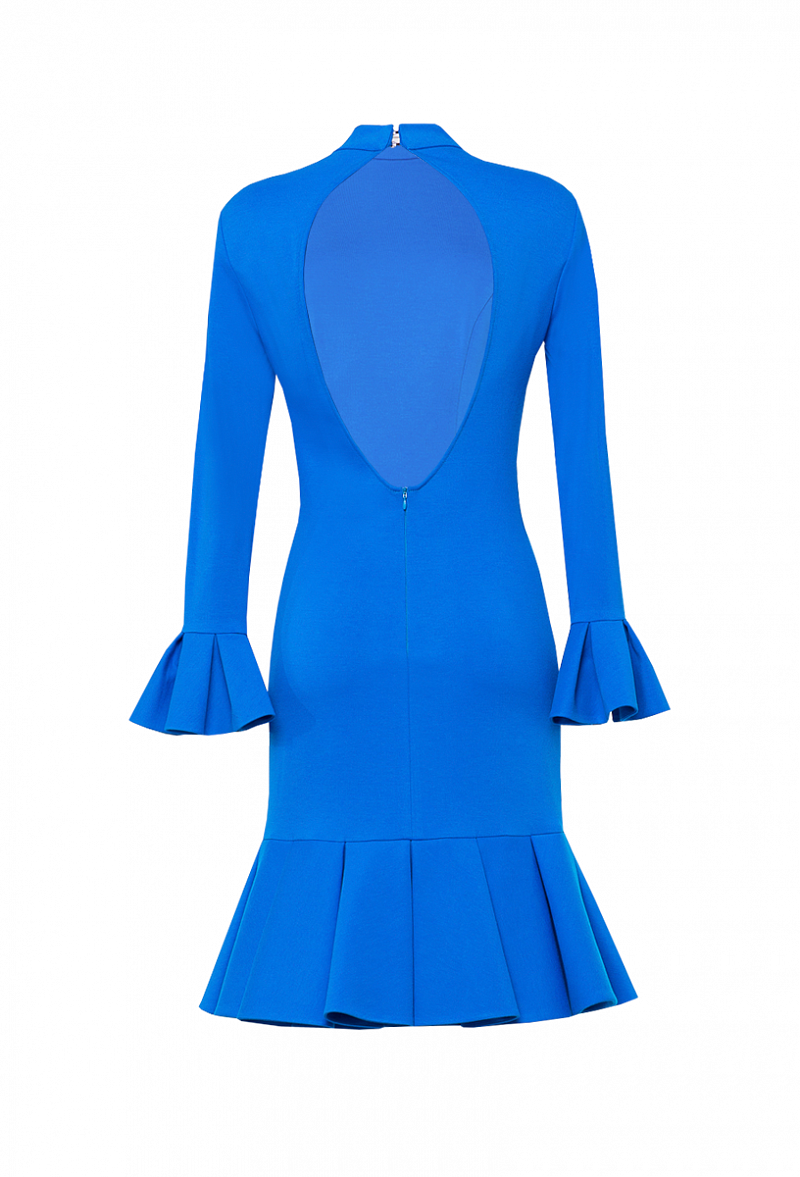 Трикотажное платье отрезное по талии, глубокий вырез по спинке, по рукавам и подолу воланы.
