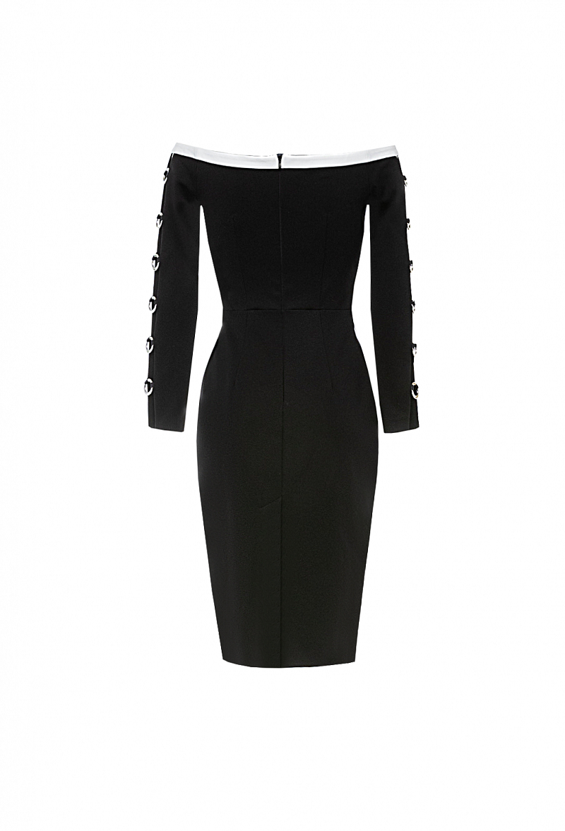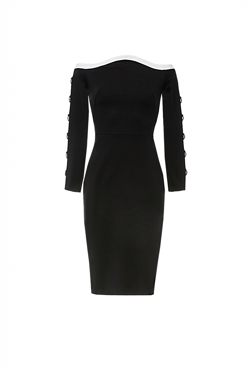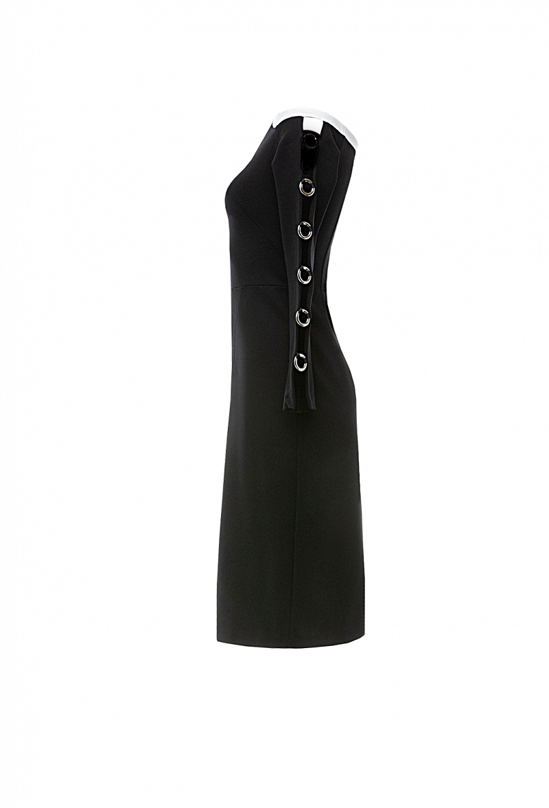 Трикотажное платье-футляр, отрезное по талии. Фигурная горловина с приспущенными плечами. Рукава декорированы кольцами.