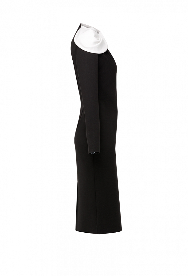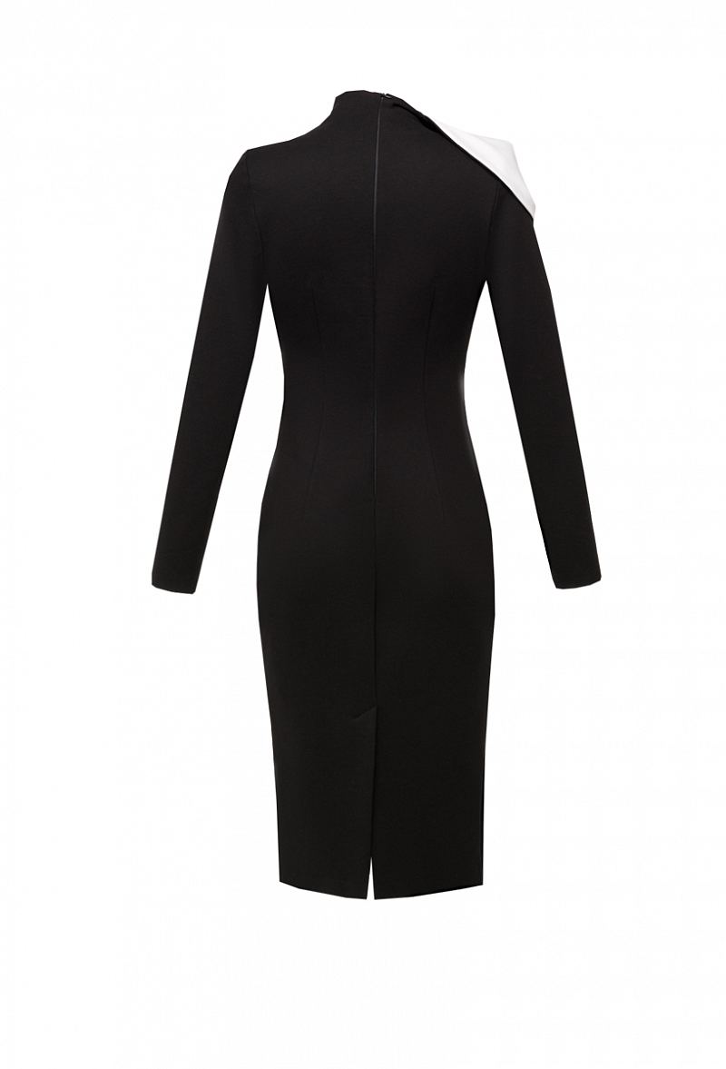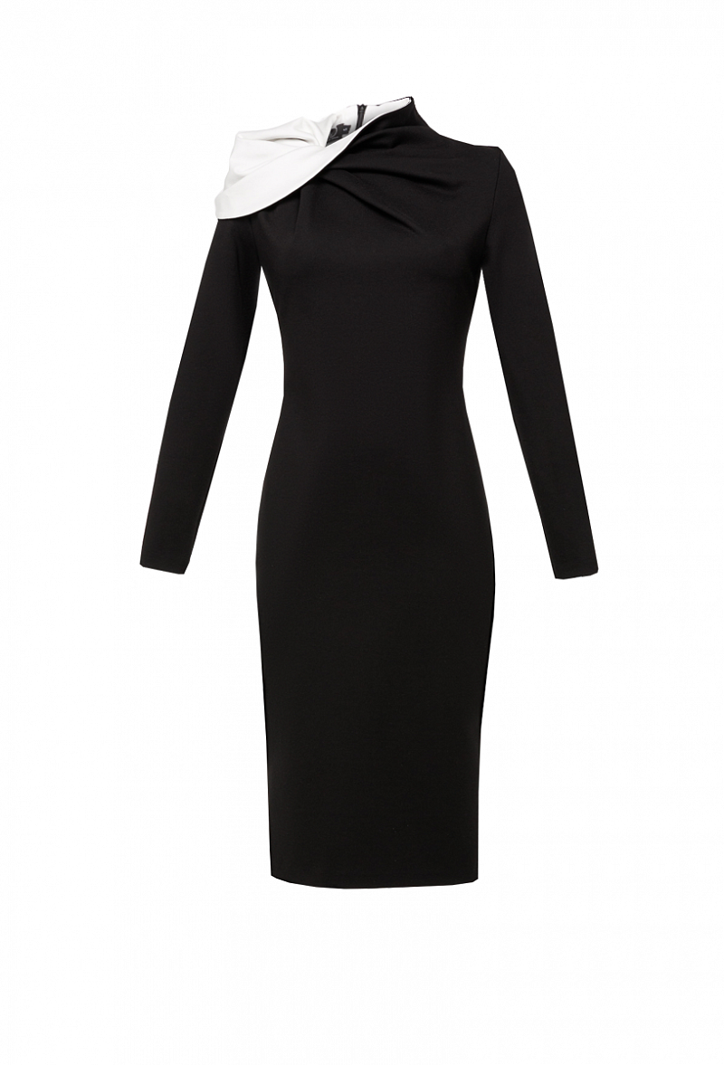 Трикотажное платье-футляр с длинным рукавом, с воротником в виде розы, с контрастной вставкой