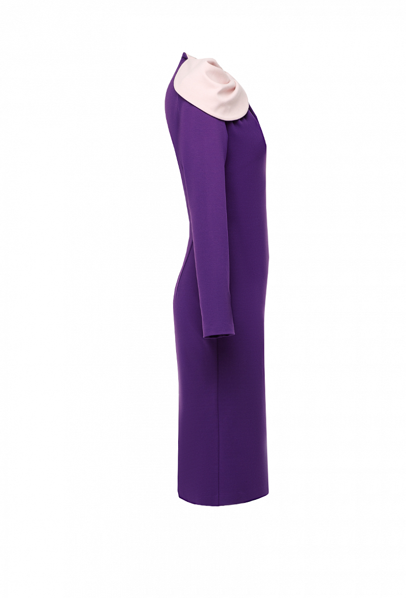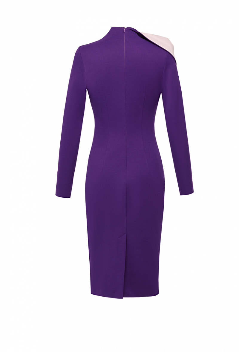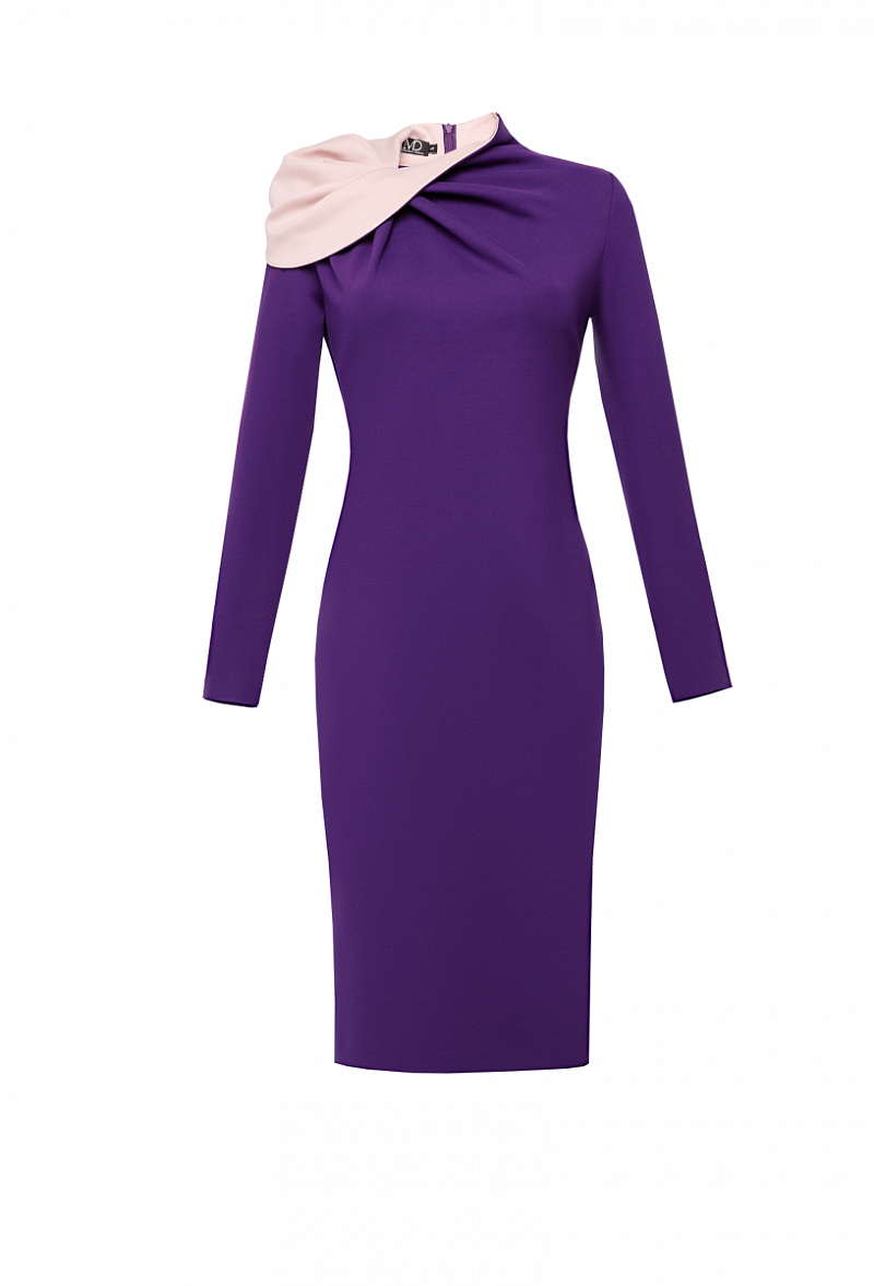 Трикотажное платье-футляр с длинным рукавом, с воротником в виде розы, с контрастной вставкой