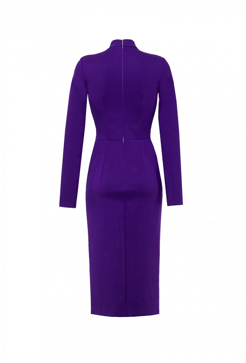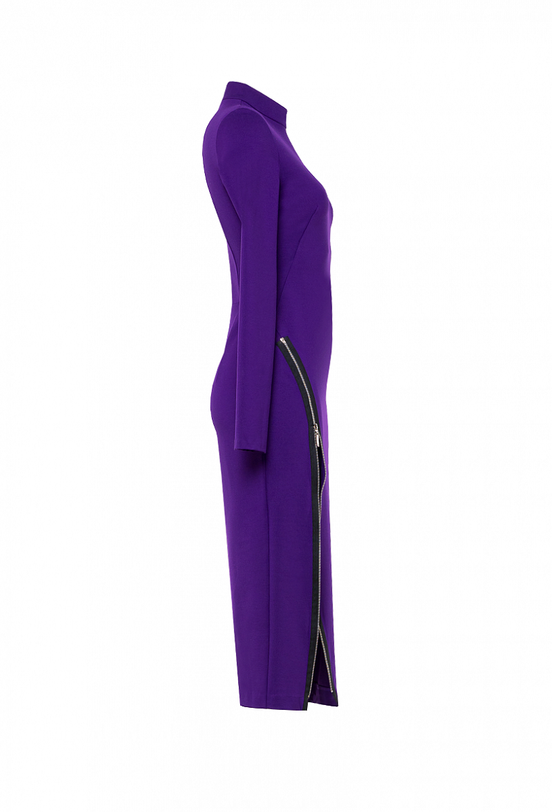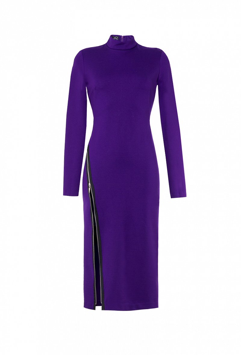 Трикотажное платье приталенного силуэта, с удлиненным рукавом с отверстием для большого пальца, воротник «стойка», декоративный элемент – застежка «молния», в расстегнутом виде создающая разрез спереди.