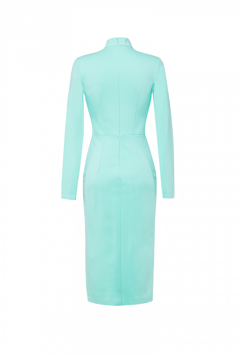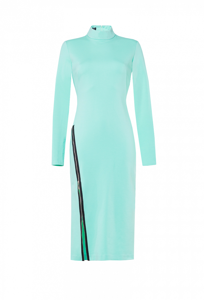 Трикотажное платье приталенного силуэта, с удлиненным рукавом с отверстием для большого пальца, воротник «стойка», декоративный элемент – застежка «молния», в расстегнутом виде создающая разрез спереди.