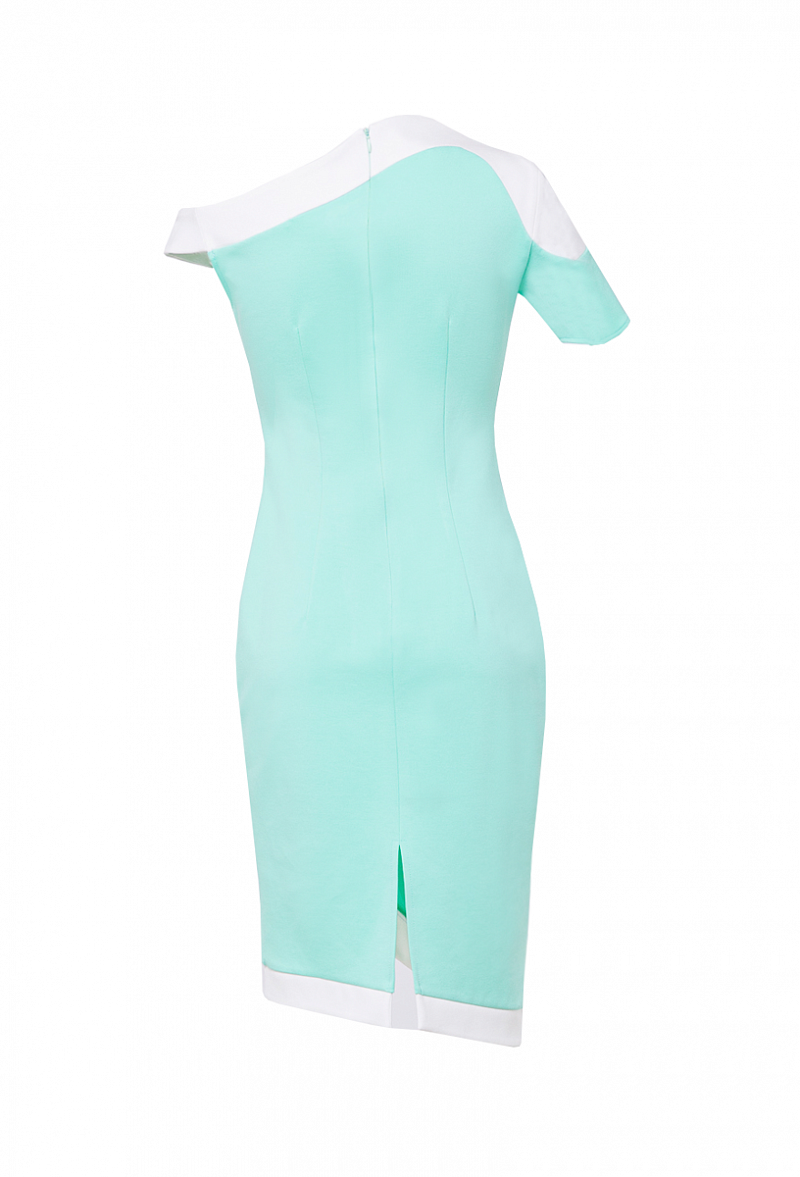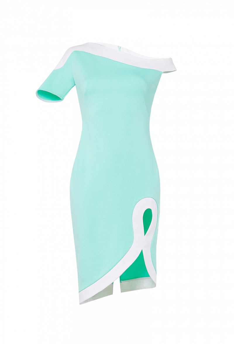 Трикотажное платье приталенного силуэта, с коротким рукавом, по горловине и низу изделия фигурная отделка контрастным цветом.