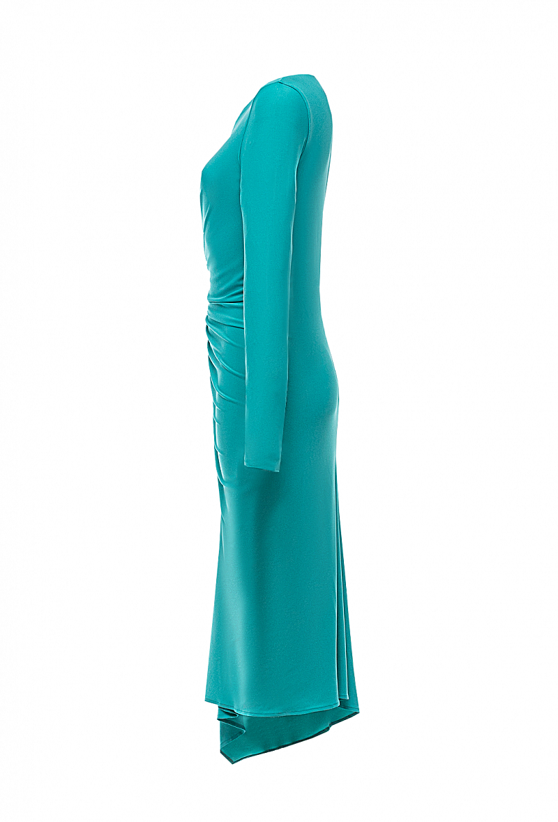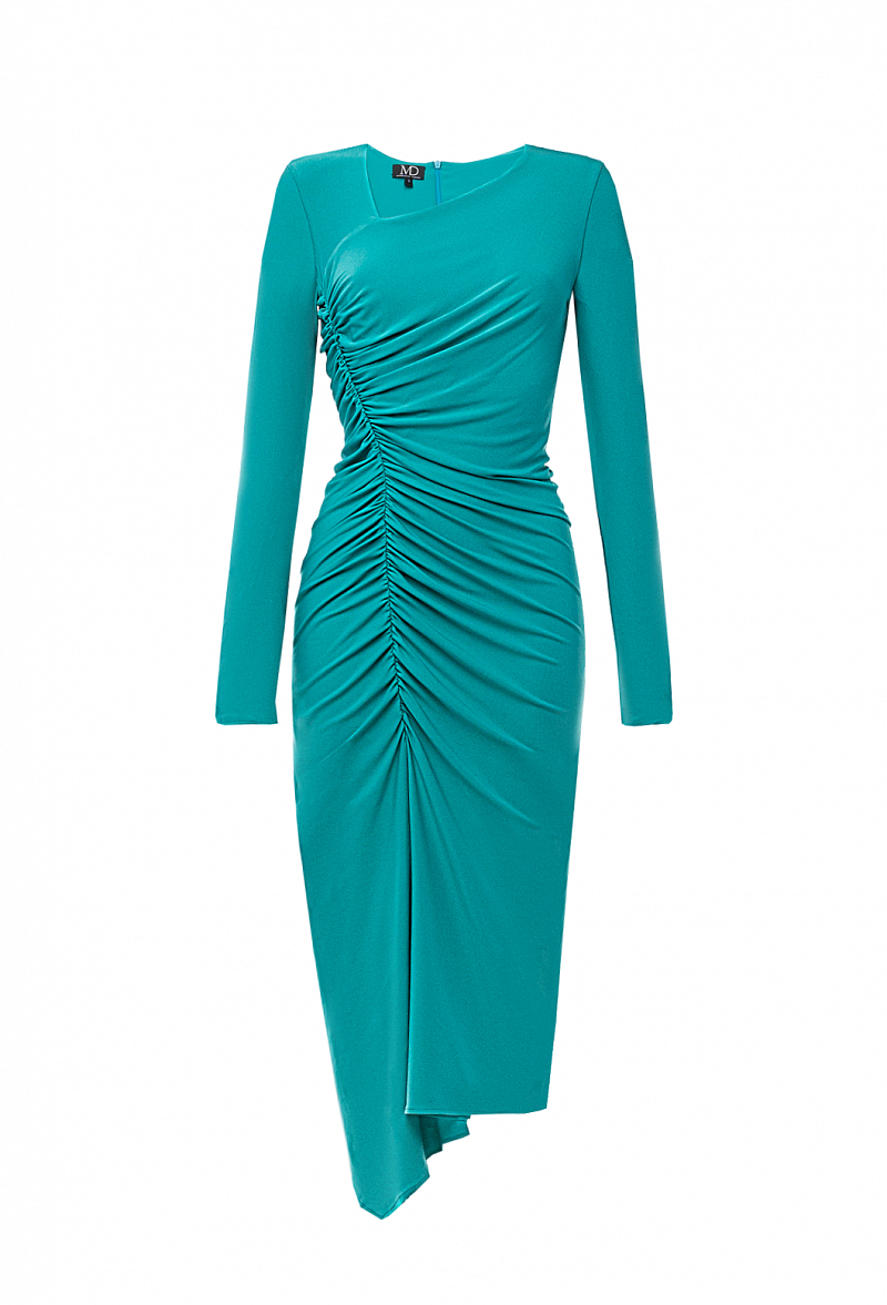 Платье-футляр с фигурным вырезом, сборкой по линии боковой вытачки, низ платья ассиметричный