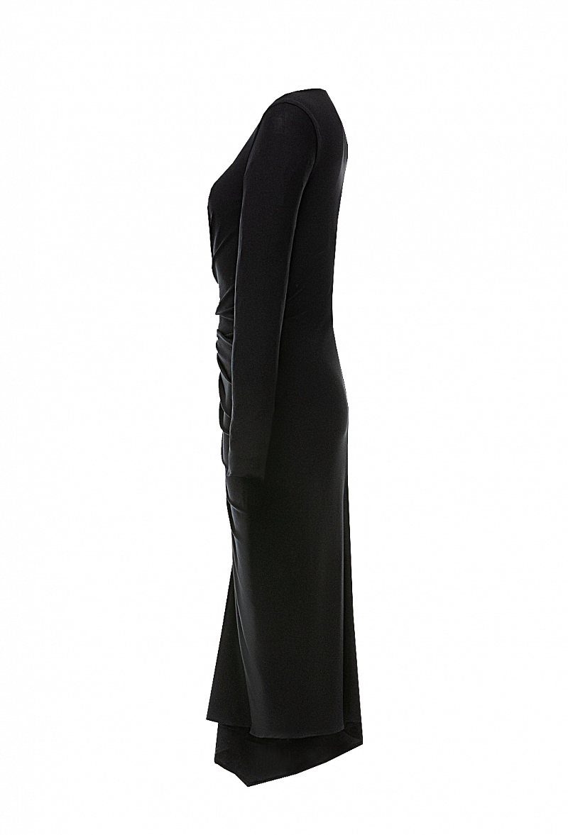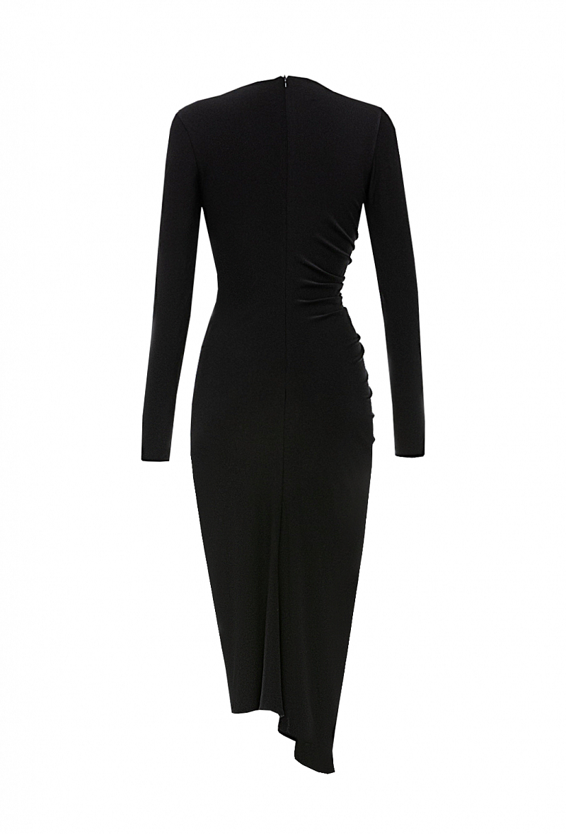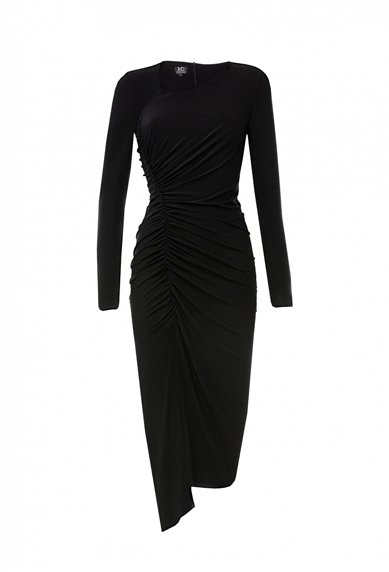 Платье-футляр с фигурным вырезом, сборкой по линии боковой вытачки, низ платья ассиметричный