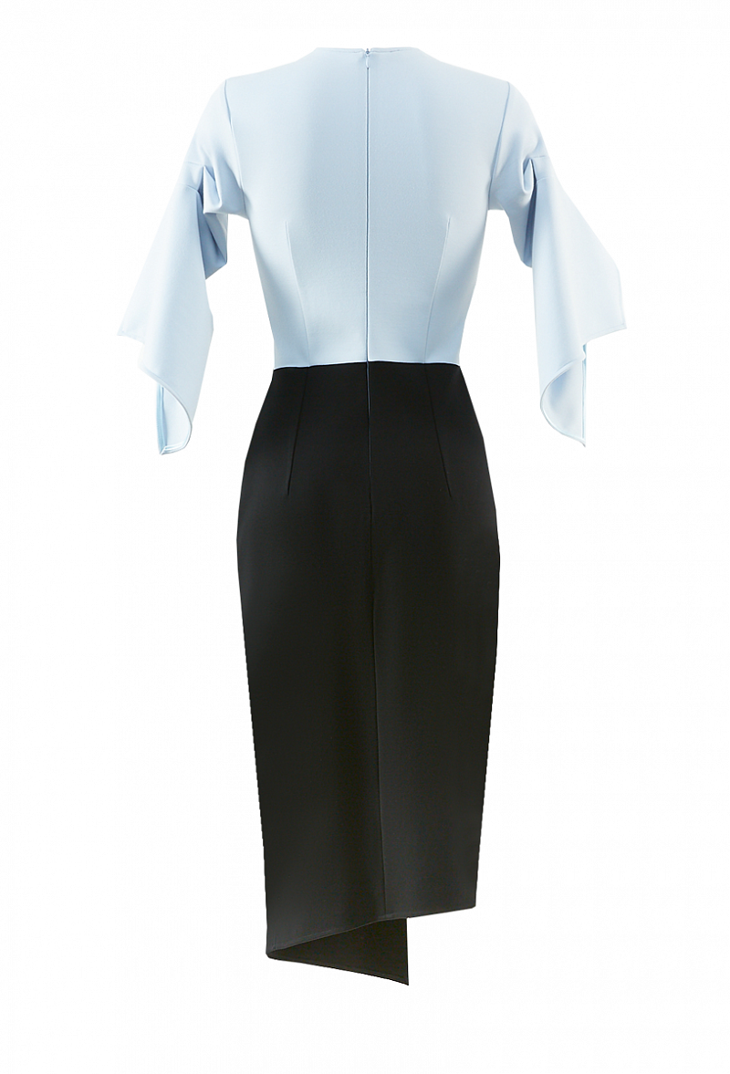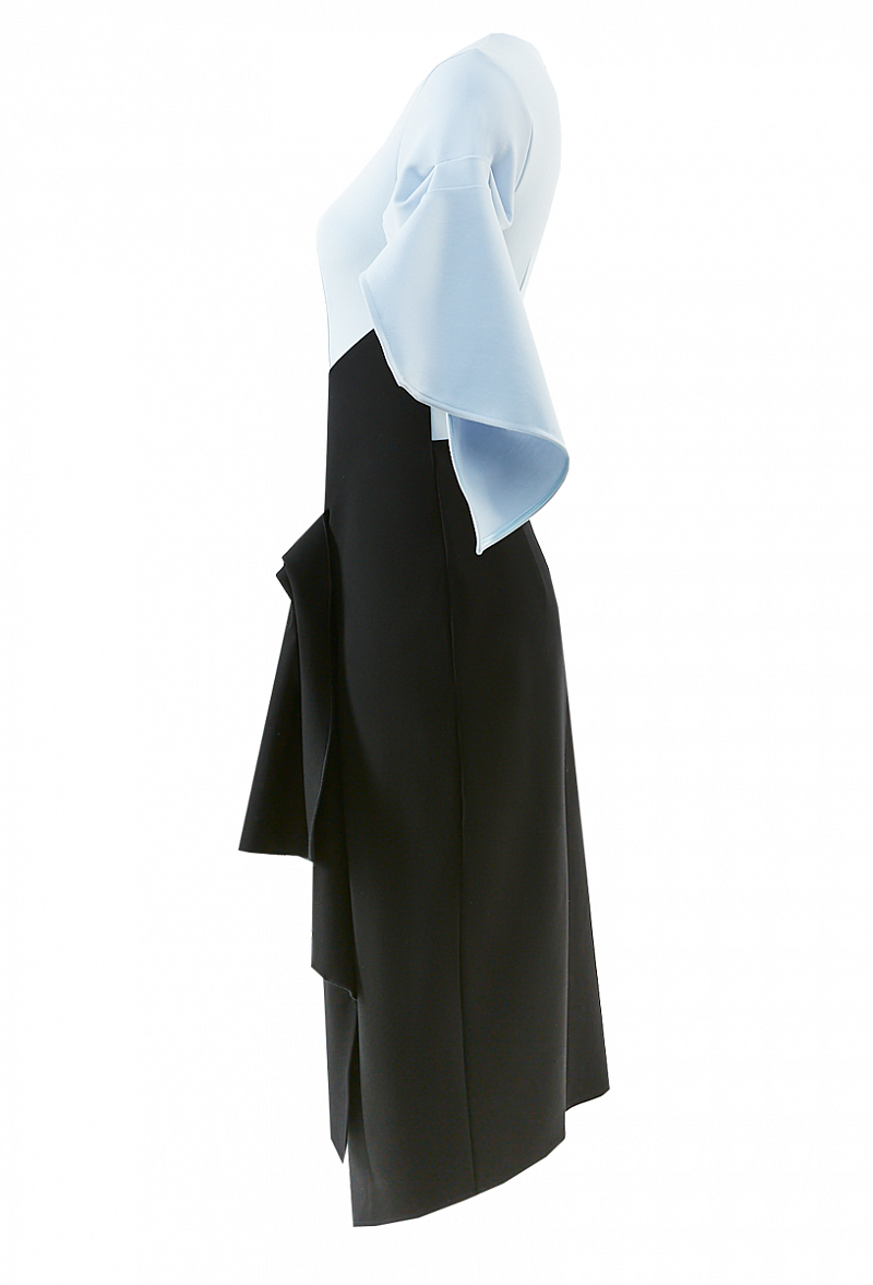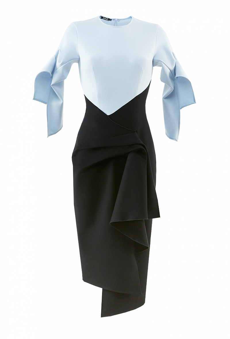Трикотажное платье с конструктивными защипами на юбке и на рукавах. Ассиметричный низ юбки.
