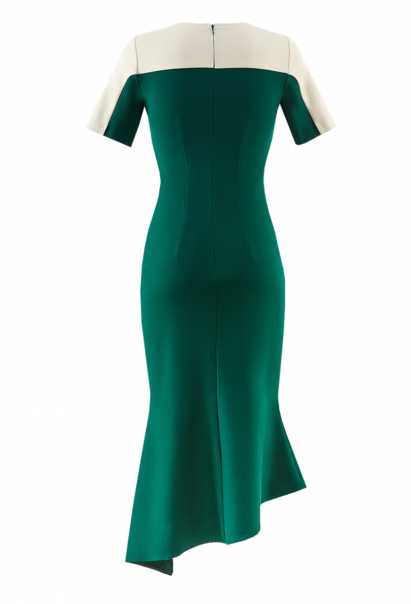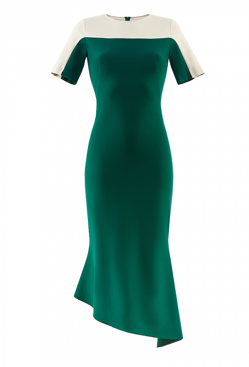 Трикотажное платье с коротким рукавом и отрезной кокеткой на полочке. Ассиметричная юбка - годе.