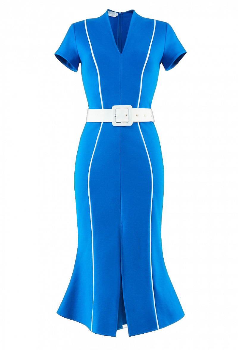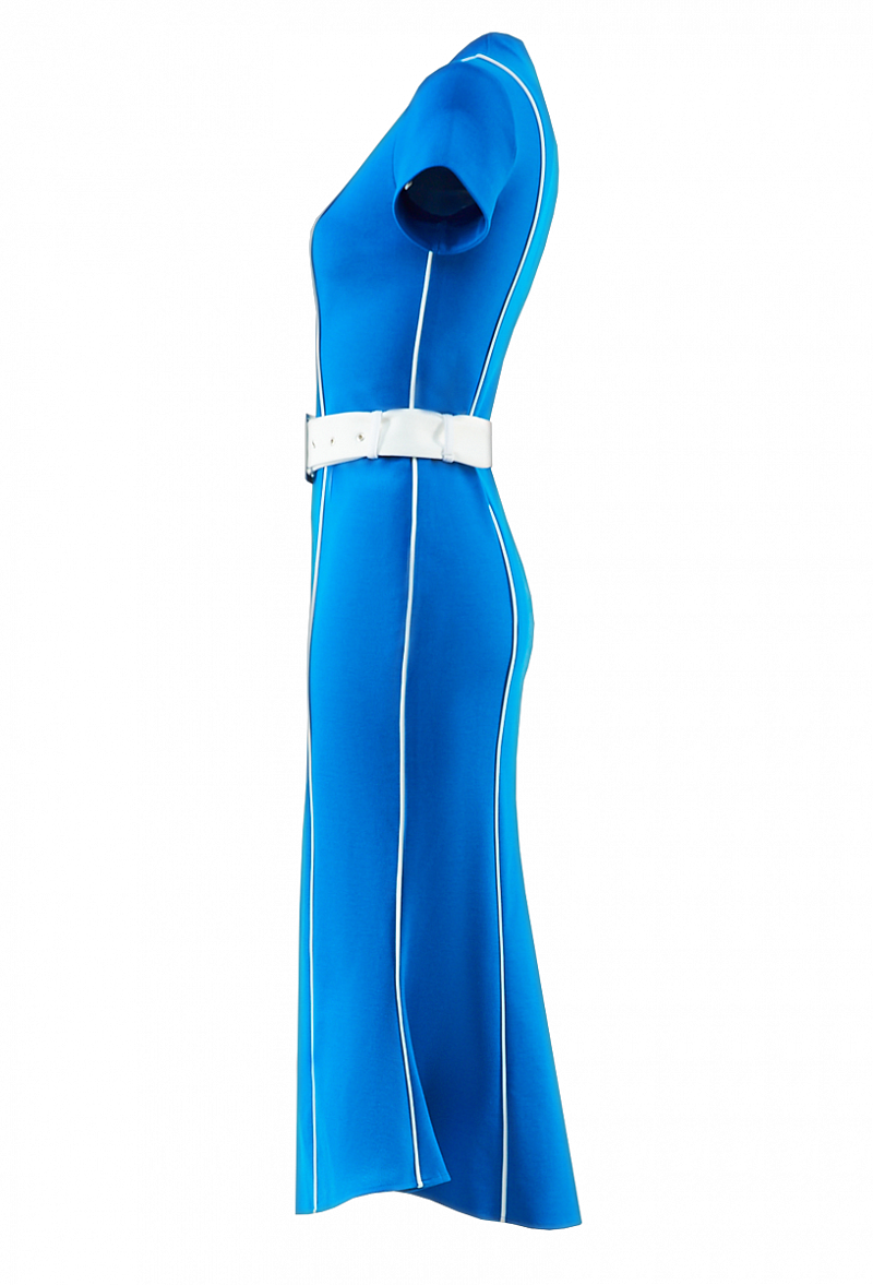 Трикотажное платье с контрастными вертикальными кантами, с поясом и коротким рукавом. Юбка - годе с разрезом по переду.