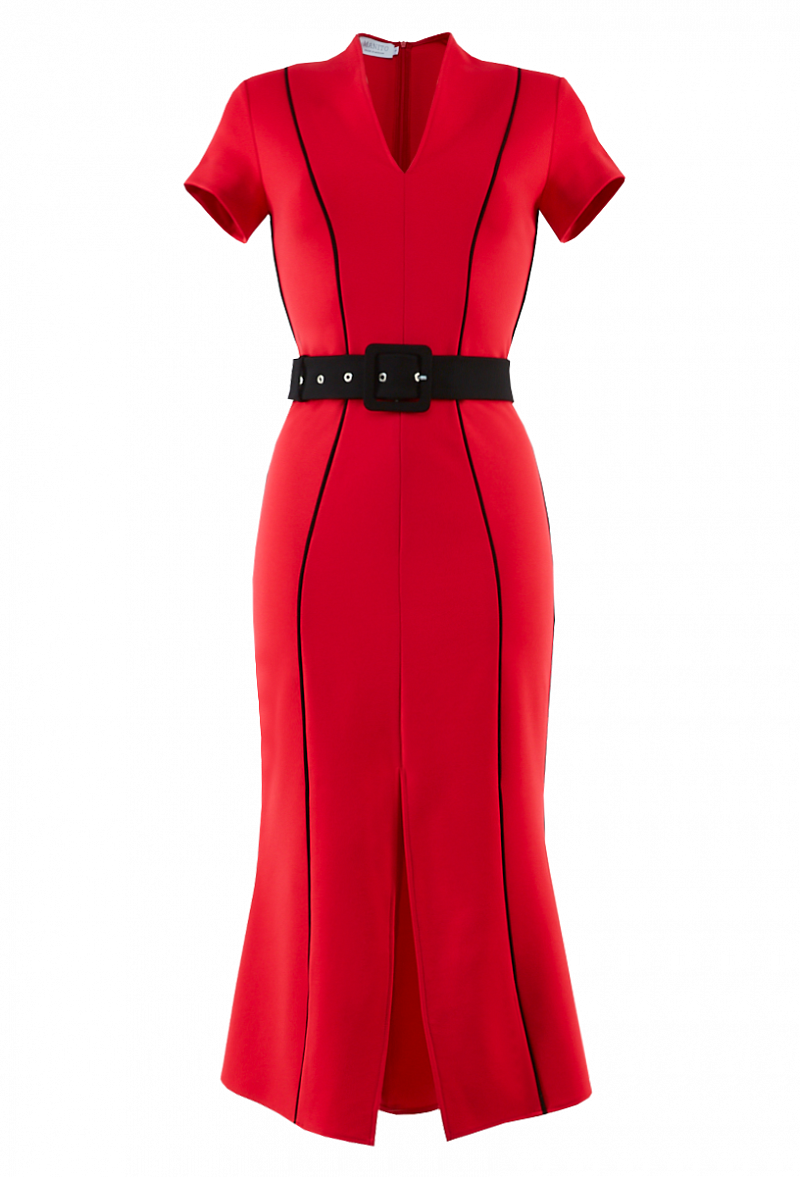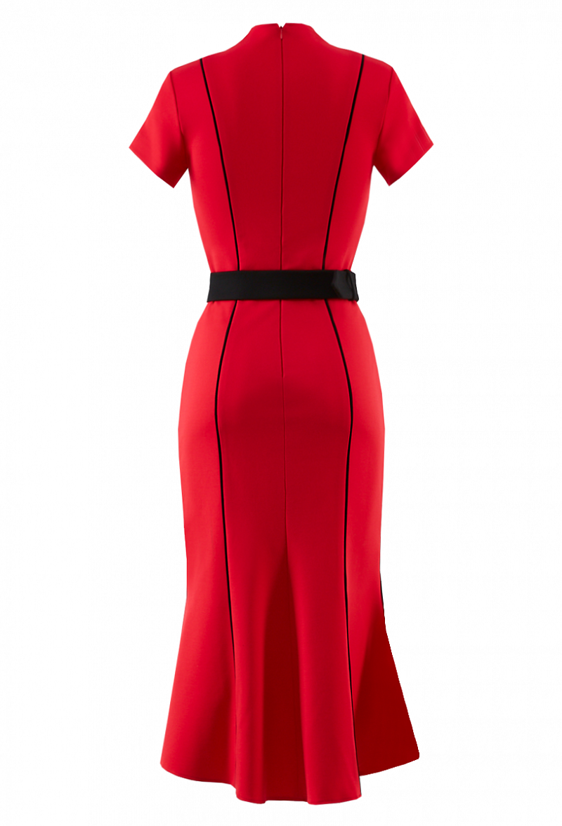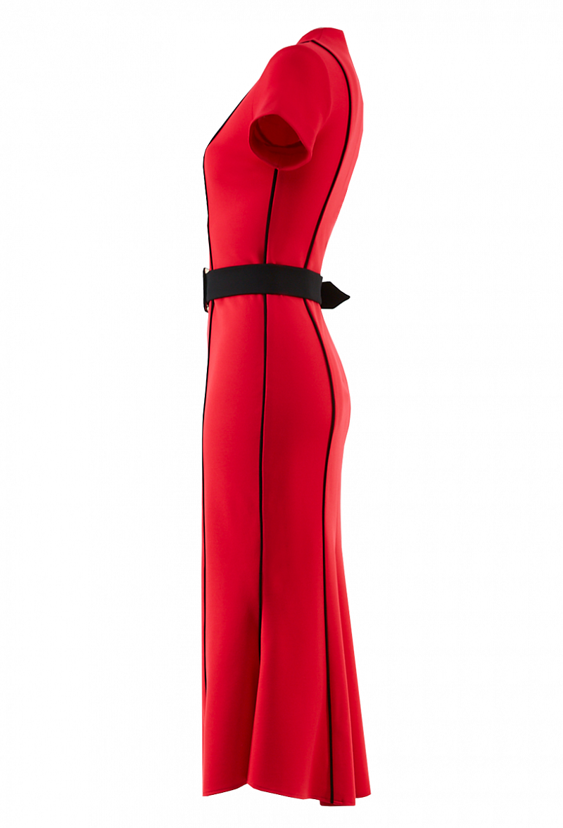 Трикотажное платье с контрастными вертикальными кантами, с поясом и коротким рукавом. Юбка - годе с разрезом по переду.