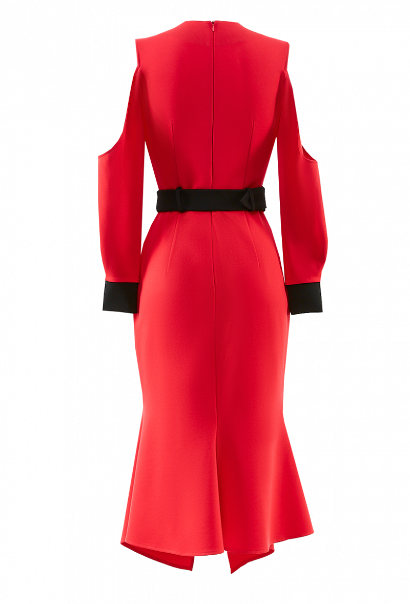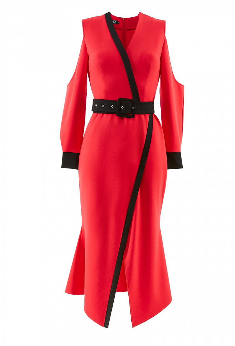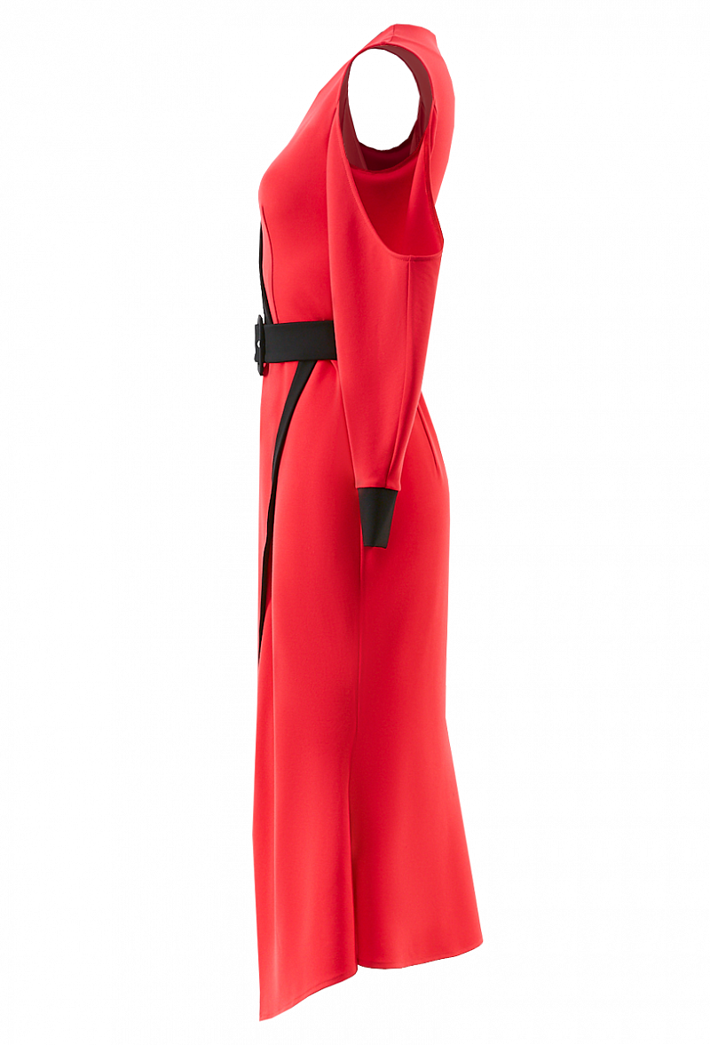 Трикотажное платье с поясом и длинным рукавом. Рукав с глубоким вырезом, с контрастным манжетом. Платье с контрастной планкой по полочке и юбке.