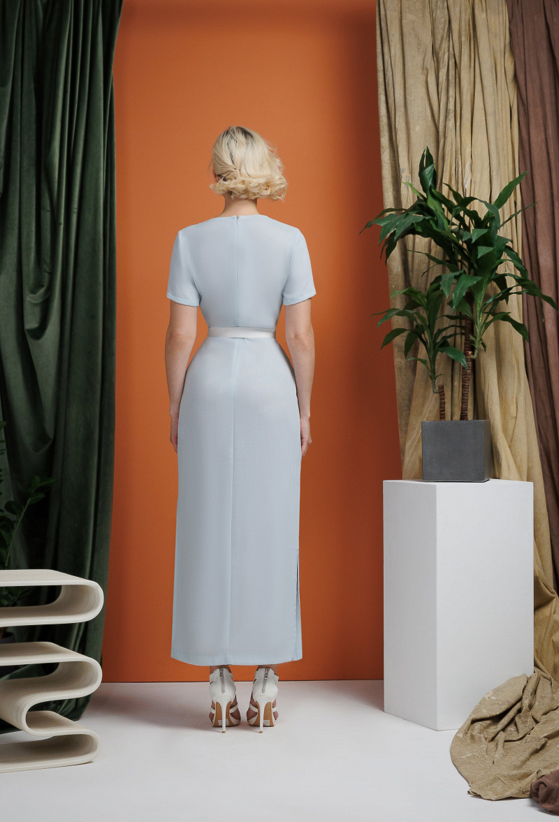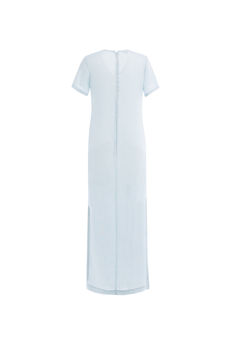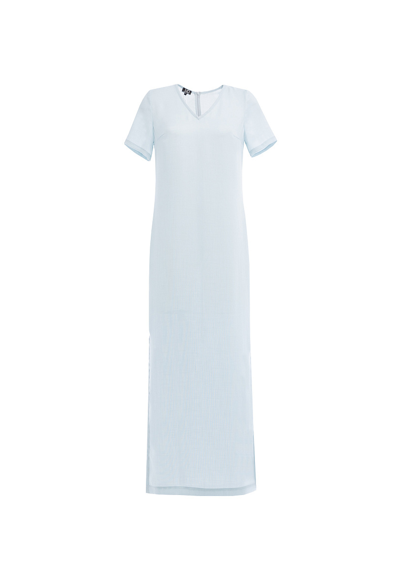 Платье-туника удлиненная с короткими рукавами, V-образным вырезом и разрезами по бокам.
