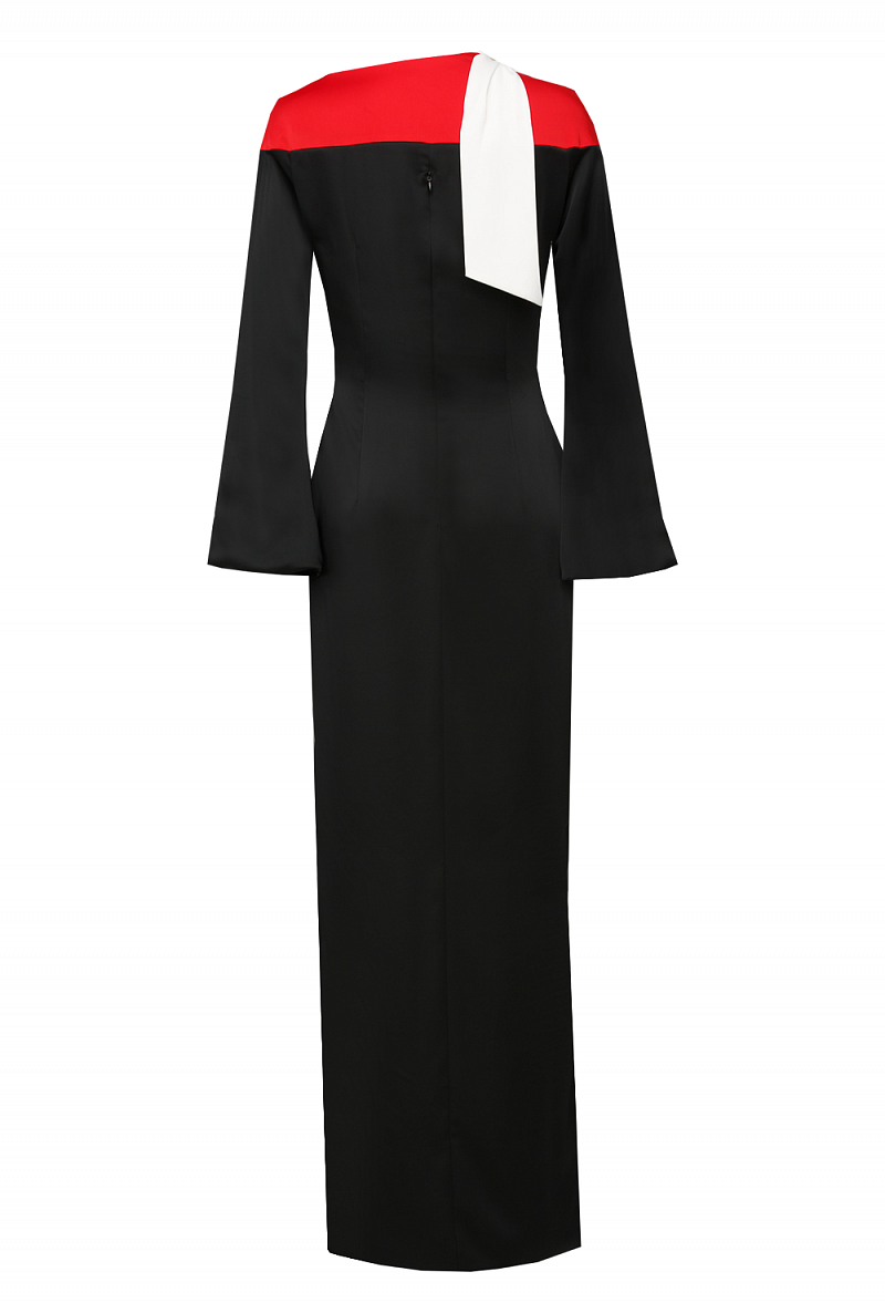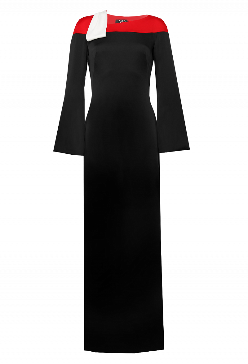 Вечернее платье с шарфиком на плече, цельнокройное, ассиметричная кокетка, рукав-колокол, юбка прямая в пол с боковыми разрезами.