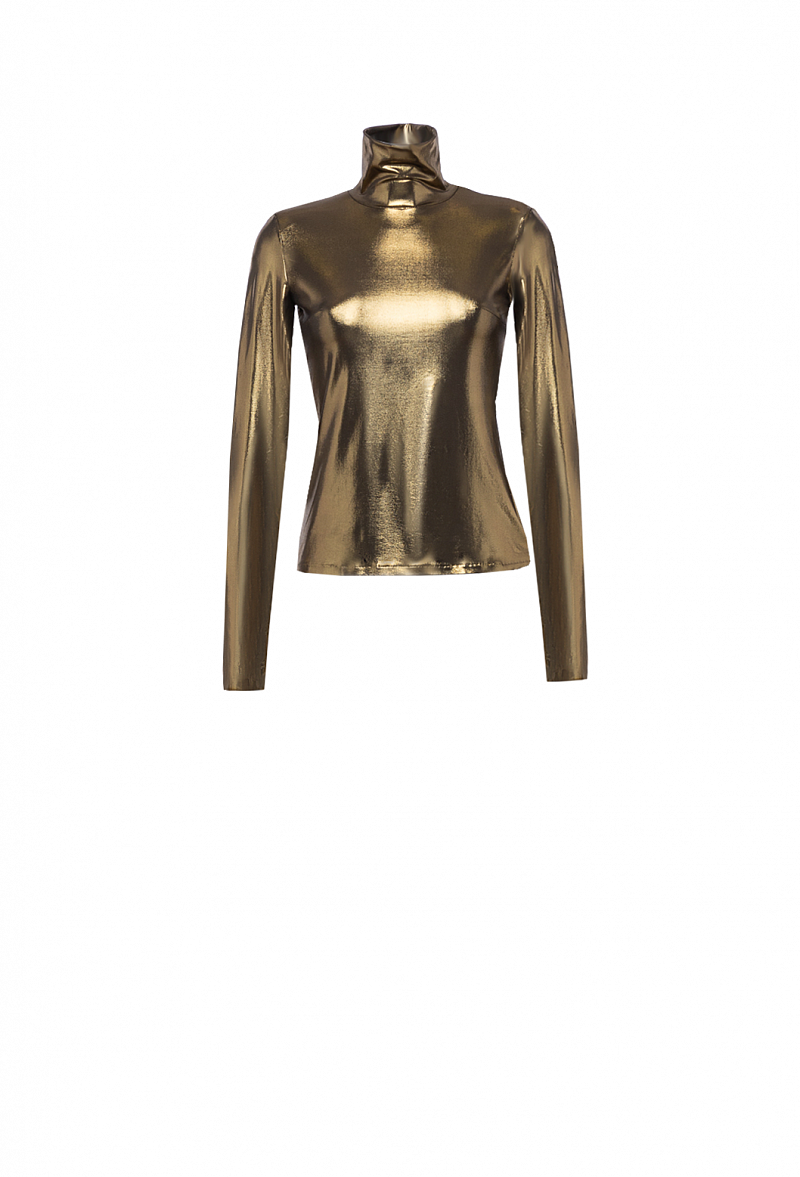 Водолазка из металлизированного крепа с длинными рукавами, в которых предусмотрено отверстие для большого пальца.
