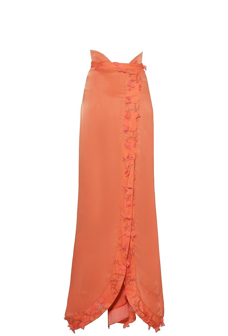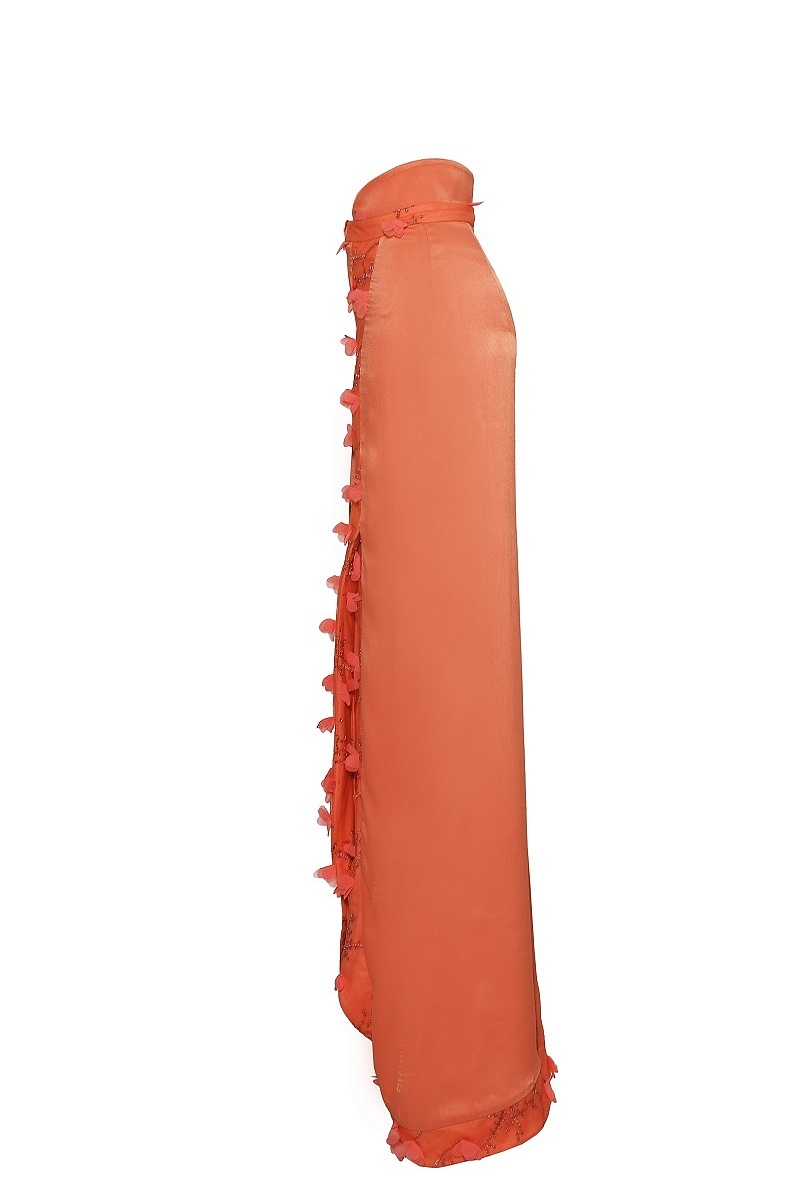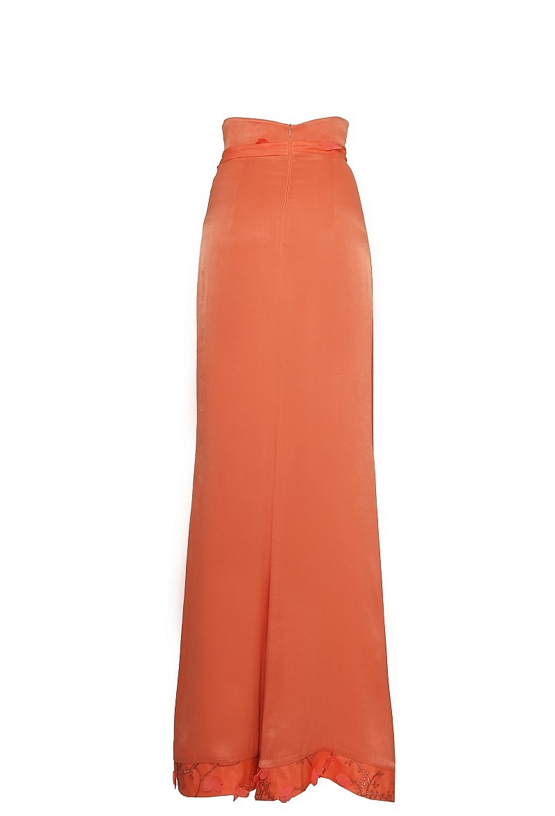 Юбка в пол с фигурным разрезом спереди и декоративной отделкой из сетки с вышивкой и аппликацией.