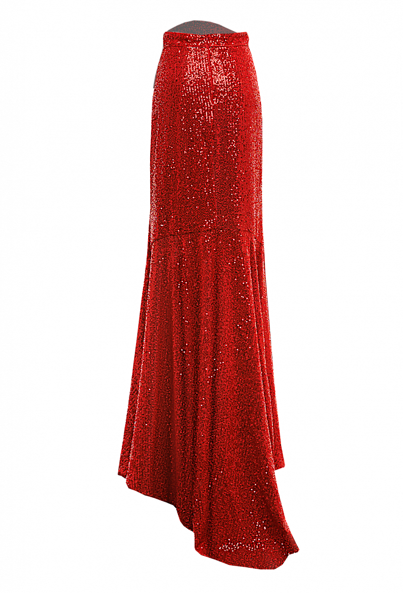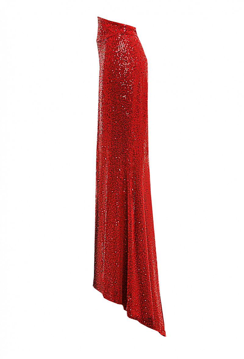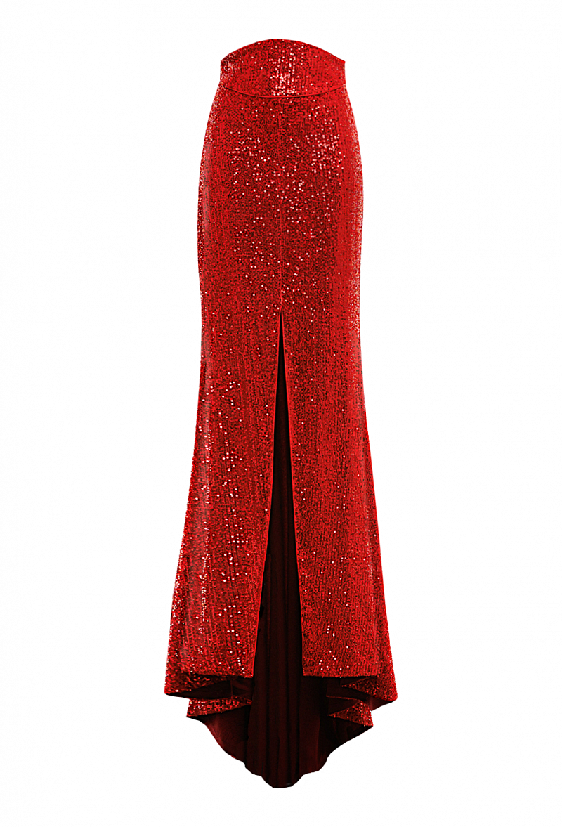 Юбка, длина макси, расклешенная к низу с разрезом спереди. Ткань с пайетками красная